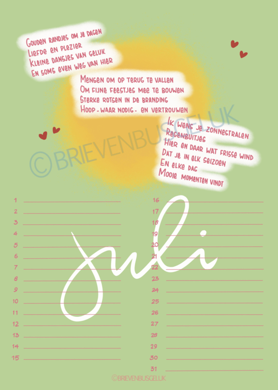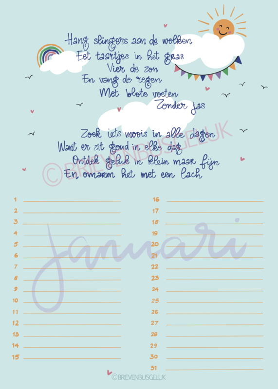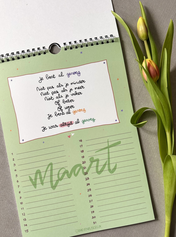 Elke maand heeft een ander kleurtje en bij elke maand vind je weer een nieuwe quote of een gedichtje van Brievenbusgeluk.